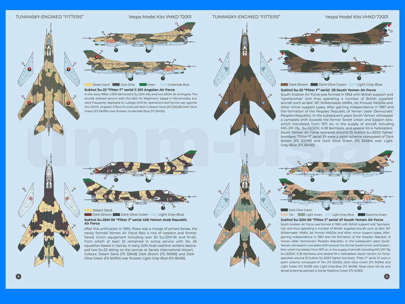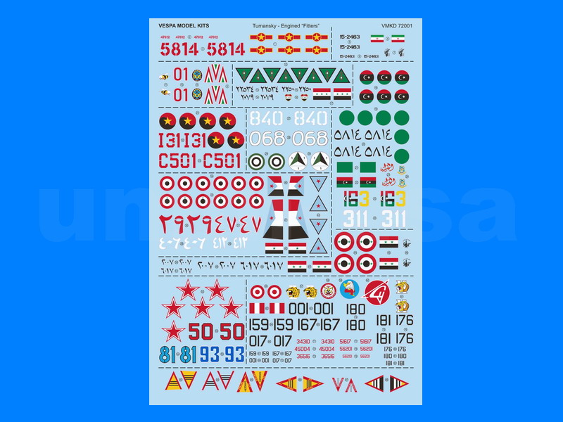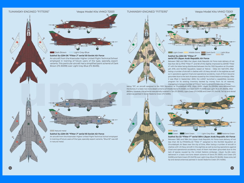 Colorful markings for the Sukhoi Su-17/22 in 1/72 scale, operated by various countries, are included in this comprehensive set.